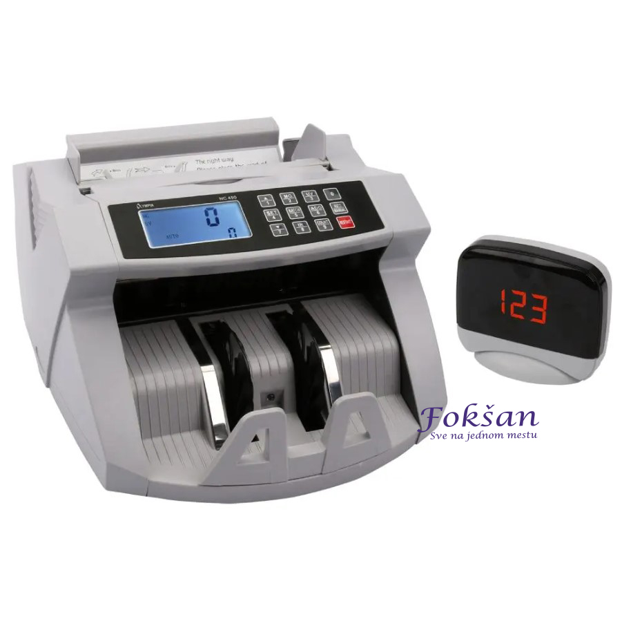 Sadrži u pakovanju: Brojač novca NC 450, naponski kabl, eksterni ekran, set rezervnih delova za remont (kajševi, osigurač, šrafciger, četka za čišćenje), prekrivač brojačice