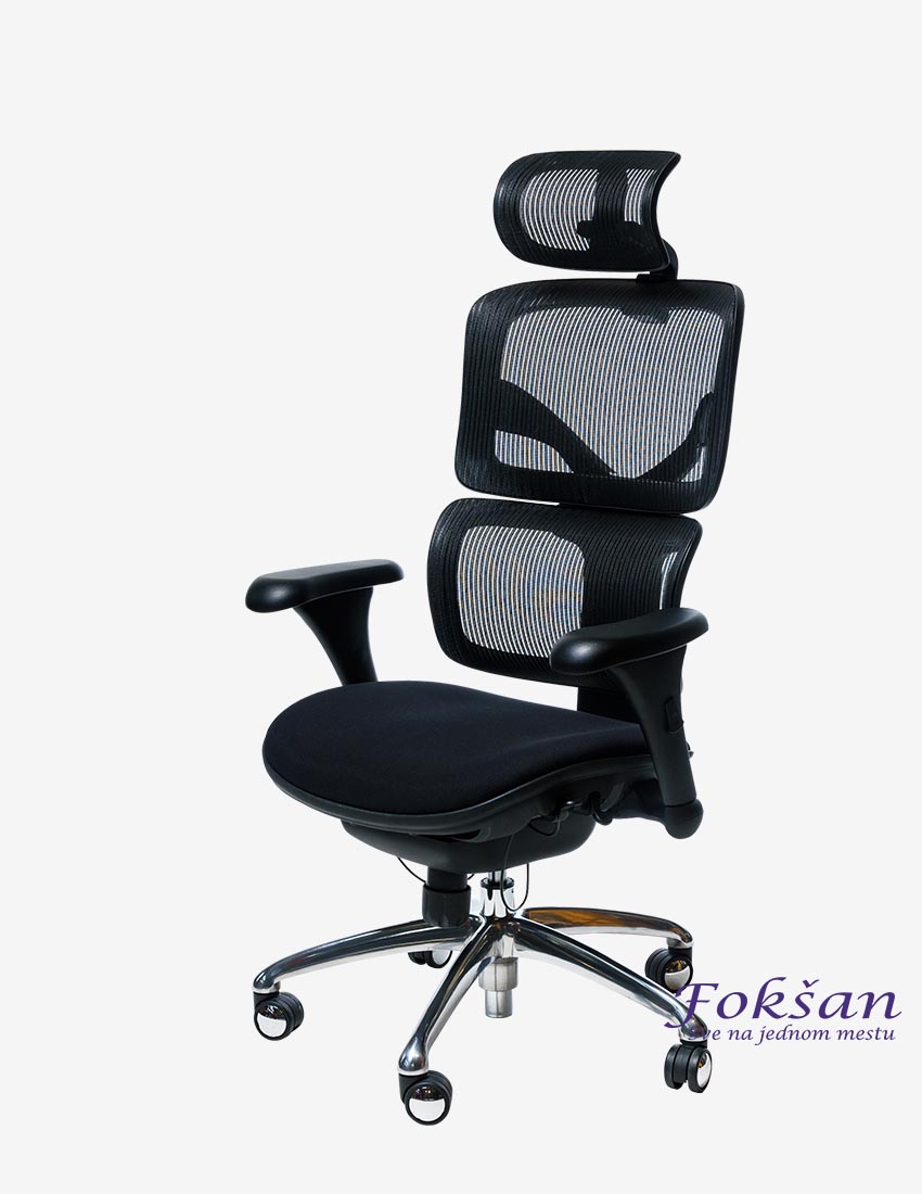 -Leđa i naslon za glavu su napravljeni od mrežnog rama koji pruža potporu i vazdušni komfor. Naslov za glavu podesiv po visini. Rukonasloni imaju mehanizam za pokretanje u dva pravca.