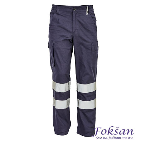 Muške radne lagane pantalone sa reflektujućim trakama; 2 bočna džepa; 1 manji džep; 2 džepa na butinama; 2 zadnja džepa; elastični delovi trake u struku sa strane; mogućnost pruduživanja nogavica.